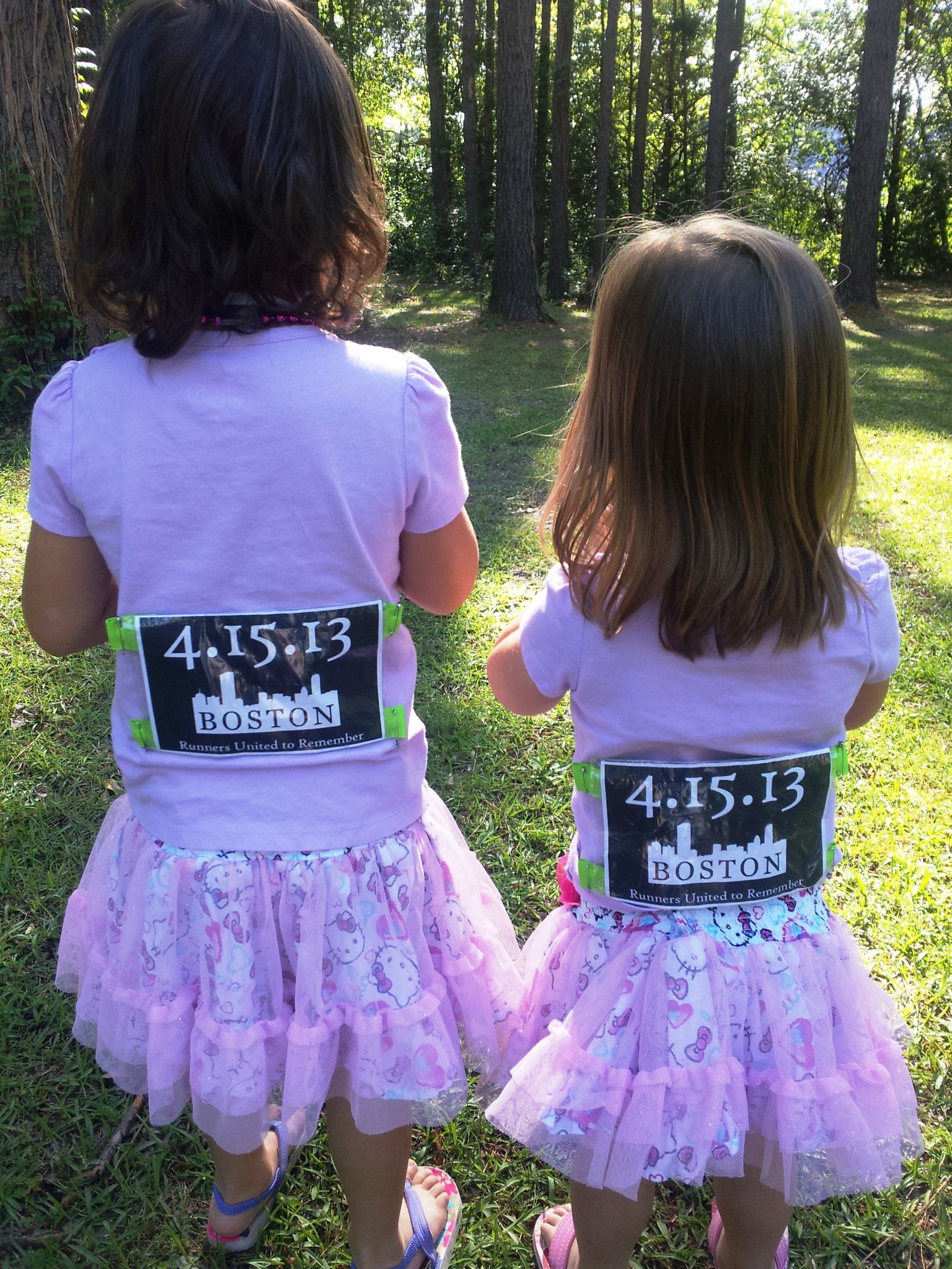 Race prep started Thursday night. I pulled out the stroller, checked the air pressure in the tires, got the famous Hello Kitty running skirts out for my girls along with some t-shirts and long sleeve shirts just in case it was on the cool side. I got my running gear out as well. Friday morning, my two-year-old got up and saw all the gear laid out in the living room…. you would have thought it was Christmas morning on account of how excited she was. After work on Friday, we made custom Boston bibs to wear and loaded up the gear in the car. I talked to my oldest and told her that we would be getting up early and that I would put her in the car in her pajamas so she could sleep; I would dress them when we got there.