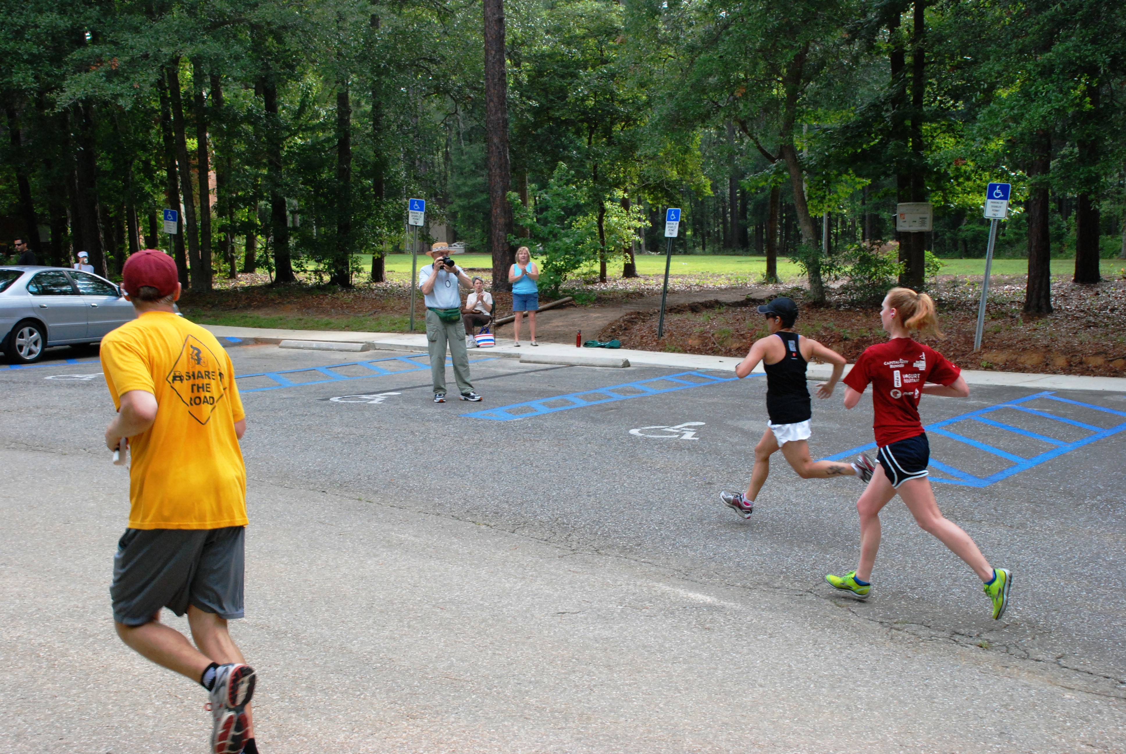My first mile felt great, but I did feel a cramp, or a stitch in my side as some would say, right underneath my right rib cage. I had to slow down going into the second mile and slowing down meant getting passed by several people. As I rounded the turn around, I began to think about all those rolling hills I had run back through. I was also passed by a gal in red with long red hair in a pony tail, aka “Red.” By the time I got to mile 3, I knew the cramp was there to stay and I was starting to wish I had many more miles to run because that would give me time to run through the cramp. I didn’t have time, I only had a mile left and Red was starting to pull further and further away.
