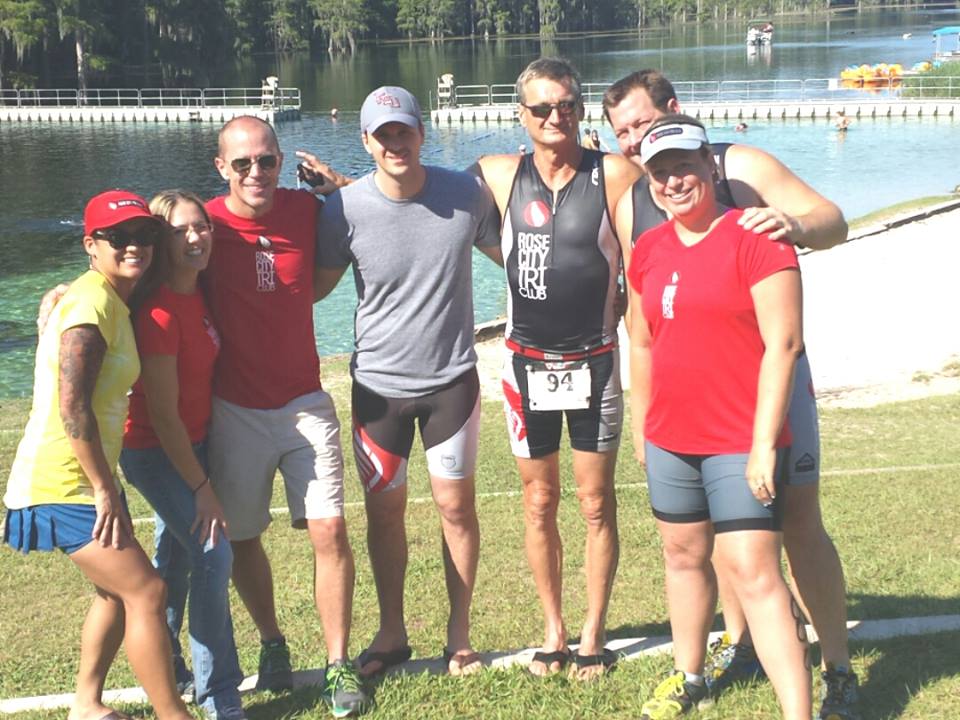 The forecast for race day: Sunny, HOT, and HOTTER. Since this was not my first time taking small country roads to Marianna, FL, I was able to enjoy the drive and not worry about getting lost. Once I arrived, I checked in, got my body marked, set up my transition, and was pleasantly surprised to see several of our Tri Club members. One of our Tri Club members looked a little nervous, more nervous than usual, and I asked her how many of these she had done. She told me this was her first and she was nervous about the cold water and the swim. I told her I would swim with her if she wanted.