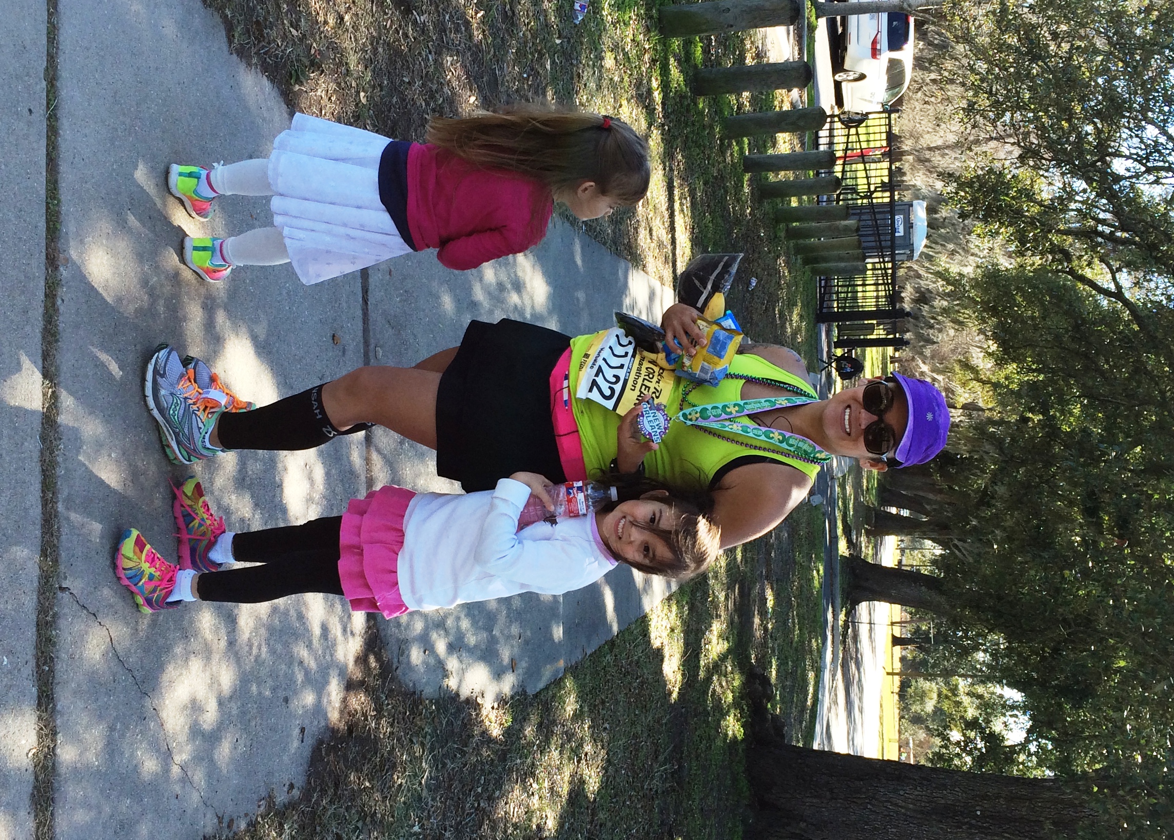 4:15 – Get up, get ready! The cold medicine in my system had me feeling miserable. My mother-in-law and girls drove me to the closest point to the race start possible (around the block). I hung out in the car with them until 45 minutes before the start of the race. As we sat in the car we watched the shuttle drop off dozens of runners. I love to check out runner get-ups and to see so many ladies wearing skirts and tutu’s made me smile and inspires my girls to want to run.