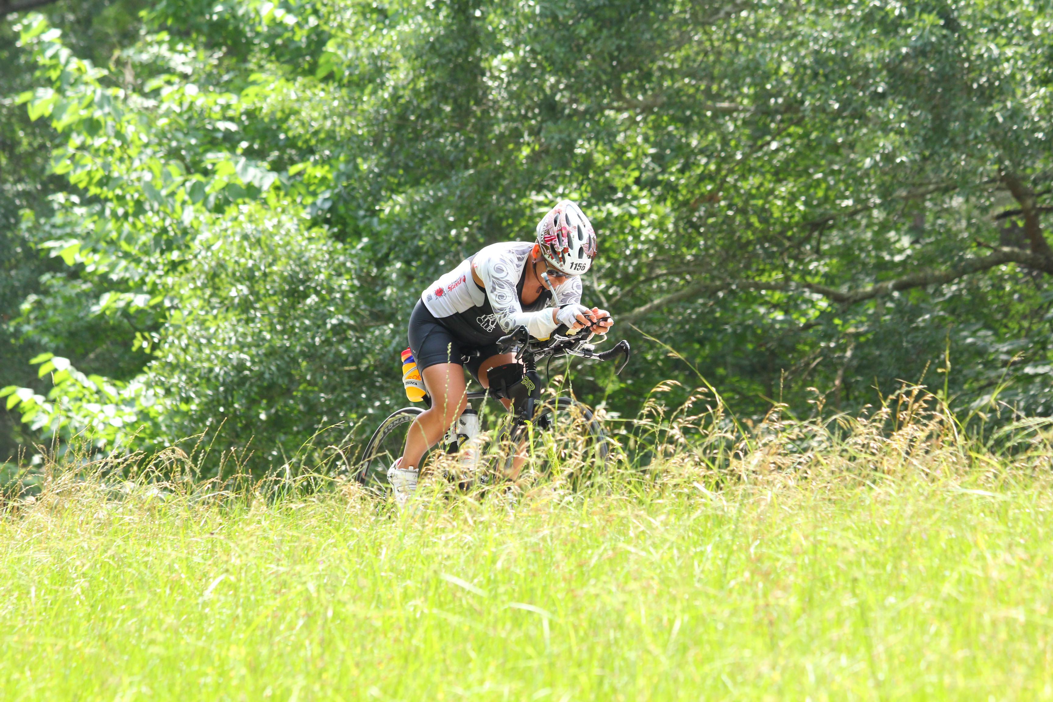 As I ran passed the bags, I called my number out and was given my bag. Once I got to the transition tent, I realized it was not my bag and hurried back out. After getting the right bag, I ran back to transition and got on my cycling gear. I ended up wearing cooling wings, the tri top I swam in, cycling shorts, helmet, gloves, and my favorite glasses (my cycling glasses had broken on the crash a few weeks ago and I still invested in another pair). There was so much mud everywhere that putting my cycling shorts on proved very difficult. I took a few gulps of water while in transition and then carried my socks, cycling shoes, and a towel out with me. I visited the sunblock angels and then found my bike. I put my bike over my shoulder and carried it out of transition because I did not want mud to get stuck on my brakes, which I saw a lot of.