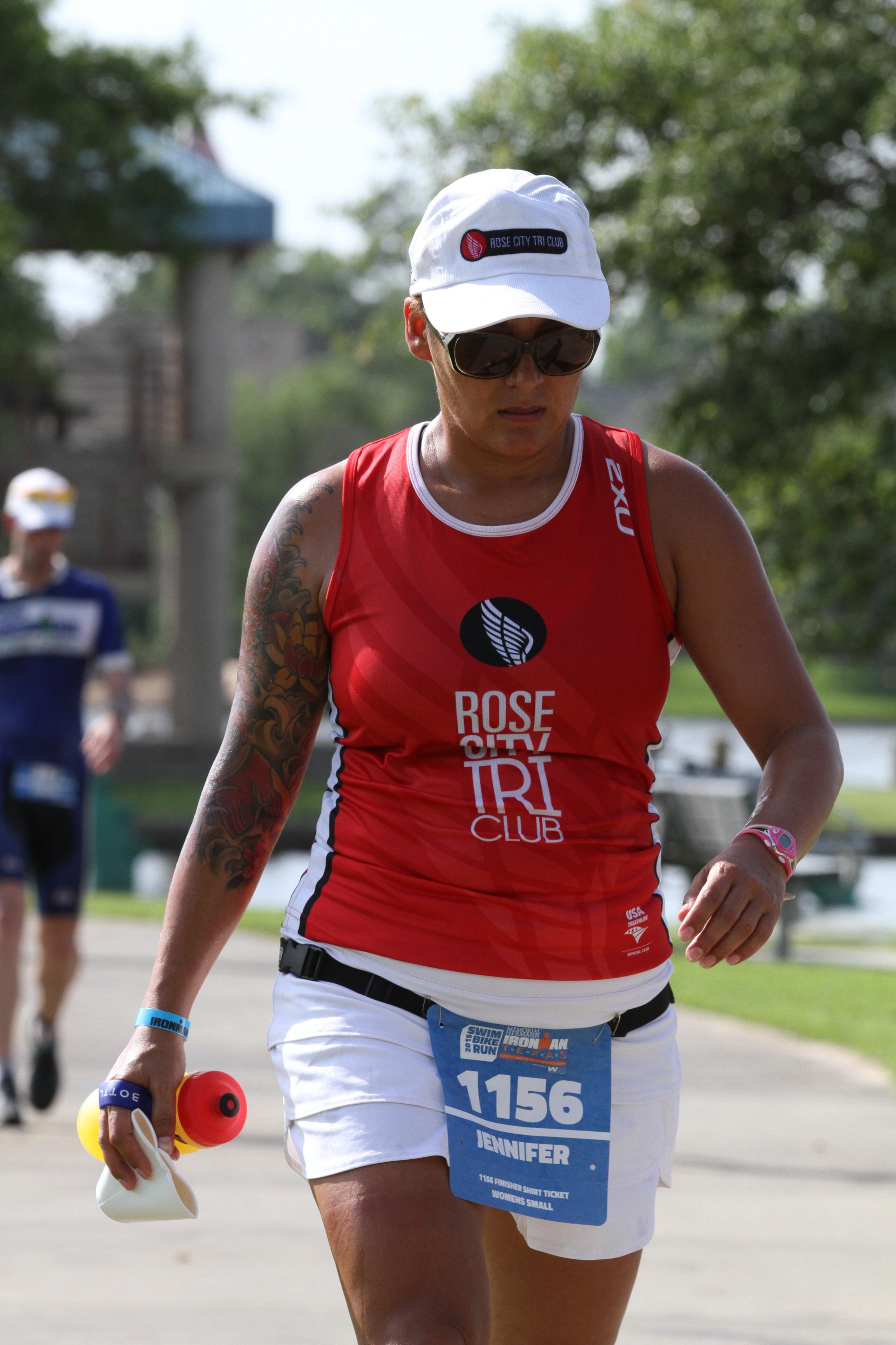 Being in a wetsuit, meant starting last, and I was actually very grateful to be at the back. As we entered the water, there was a strong smell of urine and I imagined the 2,000 other triathletes before me getting into the water and peeing right at the start so I kept my head out of the water for the first several strokes. Nothing feels as good as when you finally get to start… all the stomach churning anxiety is behind and all you have to focus on is moving forward. As we got into the water, I started off slow, after passing the first yellow buoy, the swimmers opened up a little bit and I felt like I was at the very back of the wetsuit swimmers and almost started to panic. This made my stomach fill up with air and I started burping, which felt awful. I concentrated on calming down by reminding myself what my friend Melissa had told me, “everyone out there is going through the same thing you are.” For some reason this was very comforting and I actually enjoyed when other swimmers bumped into me. Before the first turn, I was breathing bilaterally every third stroke and felt pretty decent with siting. Throughout the entire swim I didn’t ever feel like I zig-zagged too much. After rounding the first buoy, you swim perpendicular for about 100 meters before making another left turn to head home. After rounding that buoy I began to truly settle into my swim and concentrated on form. I remember Coach Annie talking about keeping my elbows bent, not starting my pull too early, and to think about my pull through the water. At this time, I actually stopped kicking and really started to focus on form and found myself passing non-wetsuit male and female swimmers and I was a little giddy. I also concentrated on going pee, which proved harder than expected. During the swim I also remembered what my friend Renee said to me, “the swim is the only part that doesn’t hurt, when you are not in the heat, and not burning up the legs. So, enjoy it.” This statement made me enjoy every stroke of the swim because I knew the Texas heat and humidity was waiting for me.