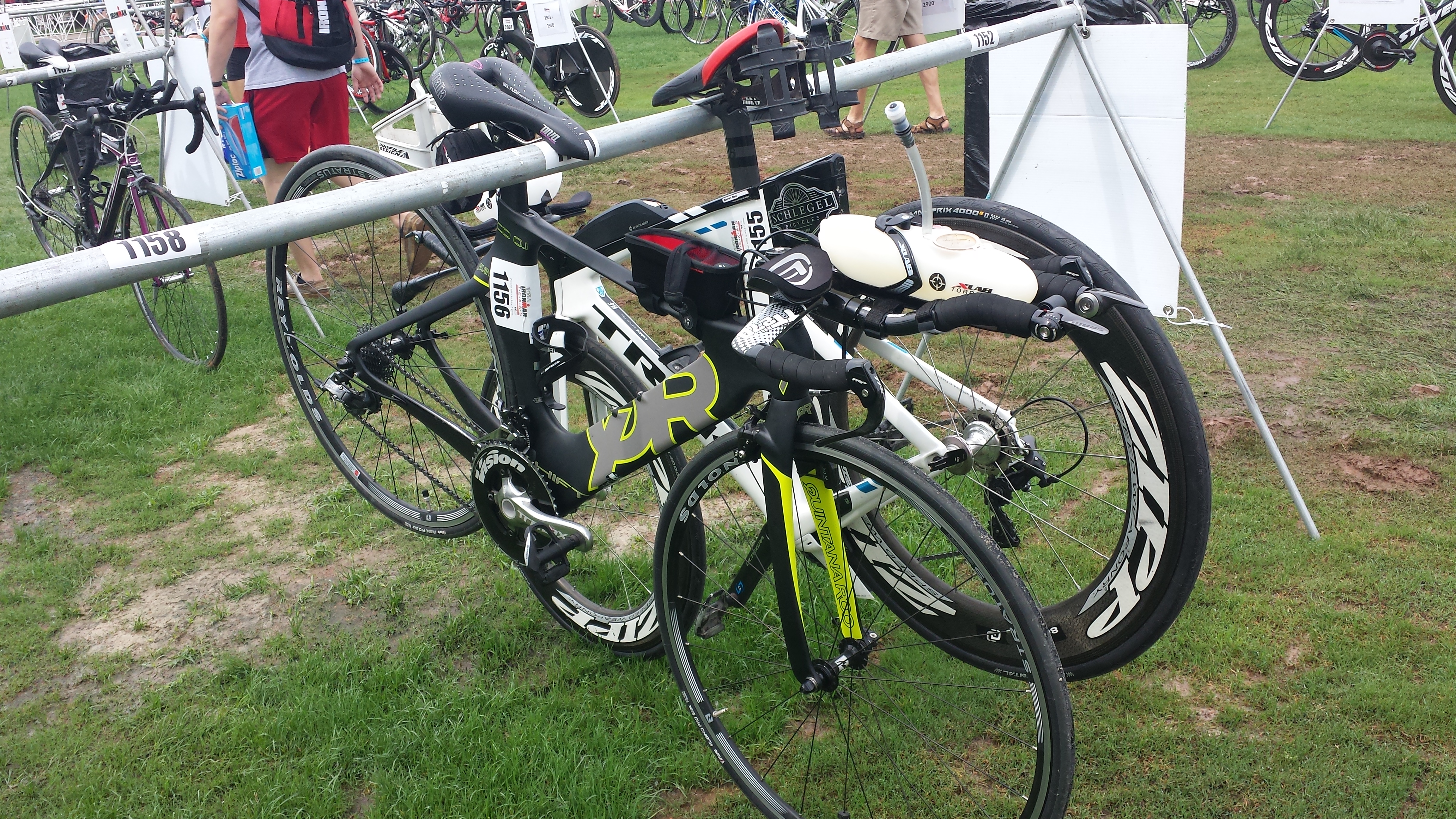 After the swim, we parked near transition and I rode my bike for about 15 minutes along the waterway to ensure that nothing came loose on bike during travel. Pumped my tires up to 10 pounds below normal pressure (per the advice of friends who had tackled this race before). After the ride, I put my gear back in my gear bags, took my bike and two gear bags to transition. I forgot to leave my water bottle in my running gear bag. I should have left it in there with just the powder mix in it – I did not know there would be ice and water in the transition tent during race day. A volunteer carried my bike over the muddy bike racks and racked my bike. I left my elbow pads and computer on my bike. Almost regretted it because the late afternoon brought about 4 hours of thunderstorms.