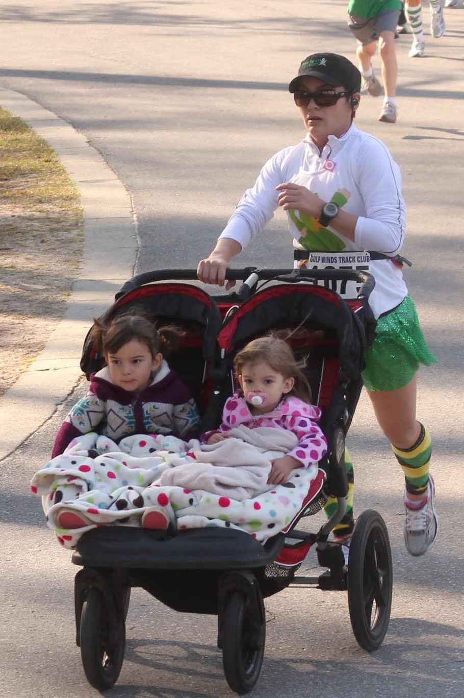 RACE DAY… my morning started just before 5:00 a.m. Got up, showered, put together my post-race Costco shopping list (sounded like a great idea at the time) and threw all remaining gear in the trunk of the car. In hopes of getting to the race location by 7:45 a.m., for the 8:30 a.m. start, I knew I needed to leave the house by 7:10 a.m….. at the latest. Normally parking is not much a concern, but when you have to situate a double jogging stroller, two little girls who might be cold, and little bitty bladders, parking suddenly becomes more important than you can imagine, especially when you have 2 yr old that thinks she is supposed to wander off every time she gets out of the car.